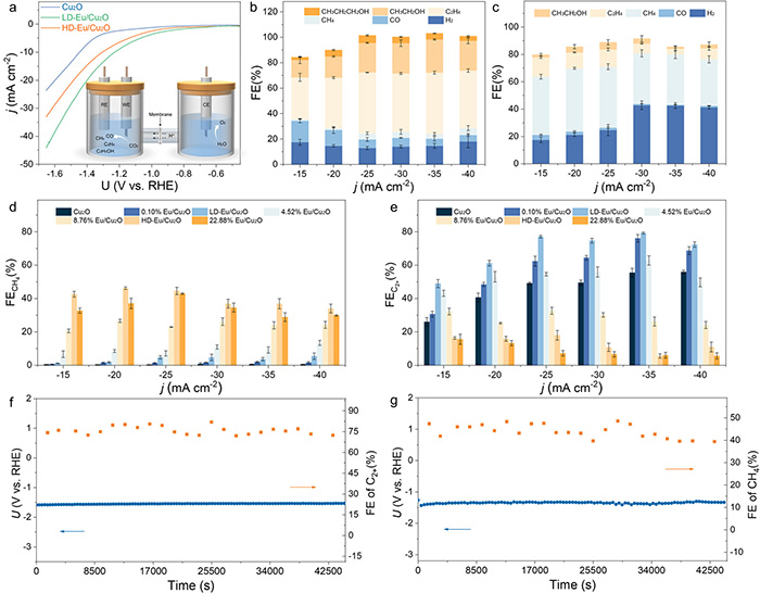 Electrochemical analysis of eCO2RR process in H-type cell. (a) LSV on Cu2O, LD-Eu/Cu2O and HD-Eu/Cu2O. (b-c) FE and the product distributions of LD-Eu/Cu2O and HD-Eu/Cu2O at different current densities. (d-e) Comparison of the average FE of C2+ and CH4 products on Eu/Cu2O at different Eu doping levels. (f-g) The stability of LD-Eu/Cu2O and HD-Eu/Cu2O at the current densities of -35 and -20 mA cm−2, respectively. ©Hao Li et al.