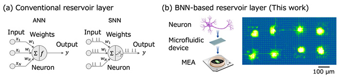 (a) Conventional neuron models used in reservoir computing. Artificial neural networks (ANNs) comprise of neuron models that sum up weighted inputs, filter the value through an activation function, and generate a continuous valued output. Spiking neural networks (SNNs) comprise of neuron models receive spiking inputs and output spikes when their membrane potential exceeds a threshold. (b) Biological neurons used for reservoir computing in this work. Rat cortical neurons are cultured in microfluidic devices that are attached to a microelectrode array. ©Yuki Sono et al.