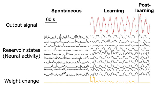 In conventional ANN-based reservoir computing, methods such as First-Order Reduced and Controlled Error (FORCE) learning enable real-time adaptation by continuously adjusting output signals in response to errors. These techniques allow artificial systems to generate a wide range of temporal patterns, including periodic and chaotic signals. However, whether similar approaches could be applied to biological neural networks has remained an open question.