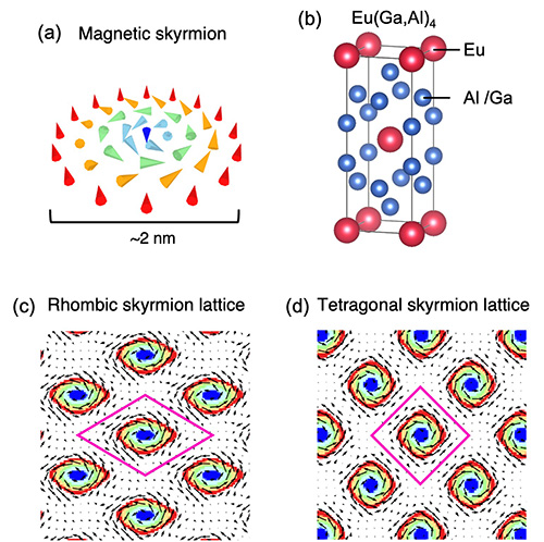 (a) Schematic of magnetic skyrmion with an exceptionally small diameter. (b) Crystal structure of Eu(Ga,Al)4. (c), (d) Schematic illustrations of field-induced rhombic and square skyrmion-lattice states. ©Yuki Arai et al.