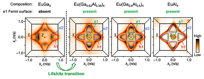 Composition-dependent ARPES intensity maps measured for Eu(Ga,Al)4. Red, blue, and green lines are guides for the eyes to trace the experimental Fermi surfaces h1, e2, and e1, respectively. The change in the Fermi surface (i.e., the appearance/disappearance of e1 Fermi surface) between EuGa4 and Eu(Ga0.62Al0.38)4 signifies a Lifshitz transition. ©Yuki Arai et al.