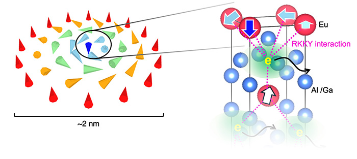 Schematic of the skyrmion formation mechanism. Left panel is reproduction of Fig. 1(a). Right panel shows a magnified view of the four spins circled in left panel. The orientations of these spins (indicated by blue and light blue arrows) are governed by the RKKY interaction mediated by conduction electrons (green shade). ©Yuki Arai et al.