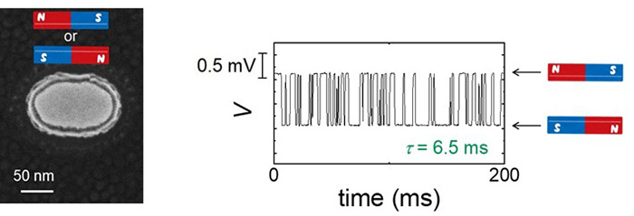 Left: Scanning electron microscopy (SEM) image of a fabricated nanomagnet device (scale bar: 50 nm). The magnetization of the nanomagnet can take two opposite orientations. Right: Representative random telegraph noise (RTN) signal measured at room temperature. The voltage switches between two discrete levels, reflecting thermally activated magnetization reversal between the two states. ©Shun Kanai