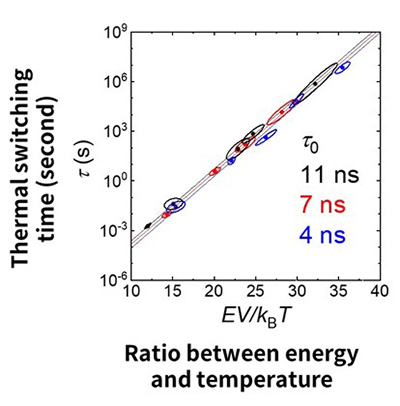 Experimental determination of the attempt time. The energy barrier was systematically controlled by varying nanomagnet size and magnetic fields. The resulting Arrhenius plot allowed the attempt time τ0 to be determined under constant temperature conditions. ©Shun Kanai