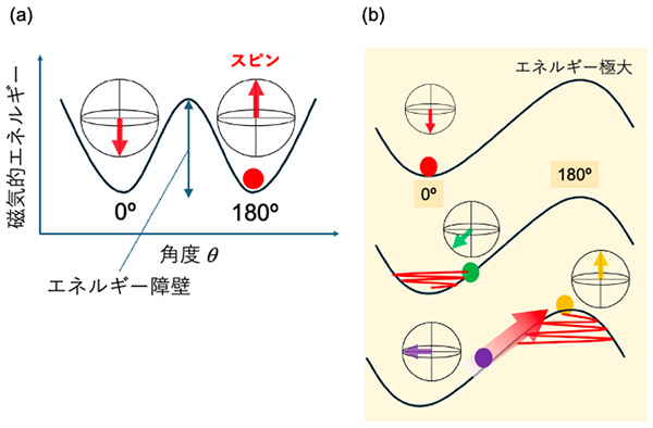 図1. (a) 一軸の磁気異方性を有する磁石のエネルギーの角度依存性の模式図。南極方向からの角度θ が0ºと180ºでエネルギーが極小となり、安定な状態となる。(b) 等方性磁石に外部磁場を印加したときのエネルギーの角度依存性の模式図。θ = 0ºのみがエネルギー的に安定な状態であるが、外部からスピントルク(太い赤色の矢印)を作用させることにより、まるで逆立ちした振り子が激しい振動によって直立を維持するように、本来は不安定なはずの磁場と真逆の向き(エネルギーが最も高い山の頂上の状態)』でスピンを安定して保持(動的安定化)できるようになる。
