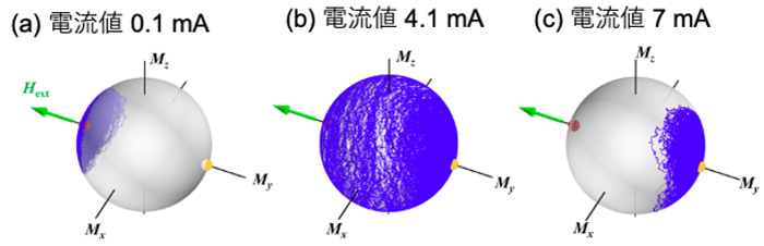 図2. 動的安定化が生じる過程におけるスピンの方位分布の計算結果。青線がスピンゆらぎの時間変化で、その密度がゆらぎの確率分布に対応する。電流値が(a) 0.1 mA、(b) 4.1 mAおよび(c) 7 mAの結果であり、4.1 mAではスピンのゆらぎが最大化されている。