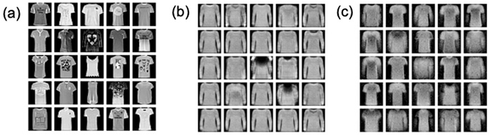 図3. 等方性磁石の特性を取り入れた制限ボルツマンマシンによる画像生成の例。(a) Fashion-MNIST の訓練データ、(b) バイナリ変数および (c) 連続変数の画像生成結果。連続変数の方が、訓練データの特徴を捉えた画像を生成している。
