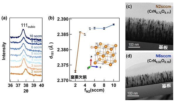 図1. (a) 各fN2で成膜したCrN薄膜のXRDパターン。(b) 各fN2条件におけるCrN薄膜の(111)面の面間隔d111。なお、d111値は、(111)回折ピーク位置から算出した。挿入図にNaCl型CrNの結晶構造模式図を示す。(c) fN2 = 2 sccmで成膜したCrN薄膜の断面TEM像。(d) fN2 = 6 sccmで成膜したCrN薄膜の断面TEM像。