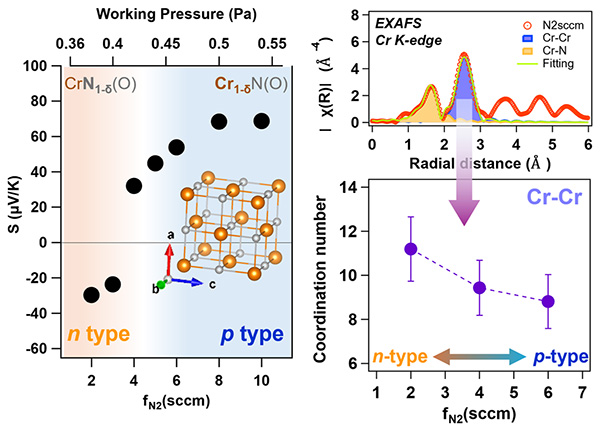 東北大学大学院工学研究科の双逸助教と須藤祐司教授らの研究グループは、スパッタリング装置内の残留酸素を活用し、反応性窒素ガス流量を制御することで、CrN薄膜の伝導型をn型からp型へと変換できることを見出しました。低流量ではN空孔によりn型を示し、流量の増加によりCr空孔が安定化してp型へと変化します。放射光実験および第一原理計算により、酸素が欠陥形成を制御する因子として機能していることを明らかにしました。