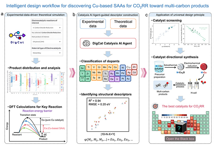 Intelligent design workflow for discovering Cu-based SAA electrocatalysts for CO2RR toward multi-carbon products. (a) Experimental-data-driven theoretical simulations. (b) Catalysis AI Agent-aided descriptor construction. (c) Application of universal design principle. ©Xuning Wang et al.