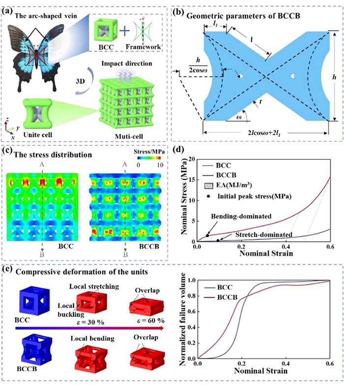 Mechanical testing and finite-element simulations revealed that the new structure significantly outperforms conventional lattice designs under both quasi-static compression and dynamic impact loading. In particular, the newly designed lattice exhibited markedly higher elastic modulus, plateau stress, and energy absorption performance. Under impact conditions, the structure effectively redistributed stress through an X-shaped deformation pathway (like a butterfly spreading its wings), suppressing localized collapse and delaying catastrophic failure.