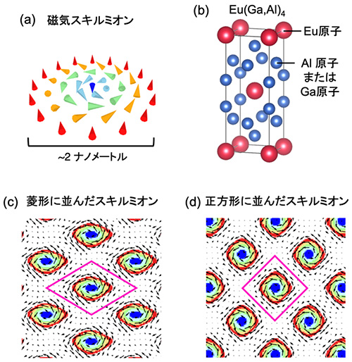 現代の情報社会を支えるハードディスクなどの磁気記録デバイスには、さらなる大容量化と省電力化が求められています。その鍵として期待されているのが「磁気スキルミオン」(図1a)です。スキルミオンは粒子のような性質を持ち、安定して存在でき、非常に小さな電流で動かせるため、情報の運び手として理想的な性質を持っており、超高密度・省電力磁気メモリなどへの応用が期待されています。 これまで、スキルミオンの形成にはDM相互作用(注7)という、中心対称性のない(表と裏の区別がある)結晶構造に特有の力が重要であるとされてきました。しかし近年、この力が生じないはずの中心対称な材料でもスキルミオンが形成されることが分かり、従来の定説を覆す発見として大きな注目を集めています。さらに、この新型のスキルミオン材料について、スキルミオンの大きさが従来の10分の1以下と小さいことや、並び方を磁場によって変化させられることなど、特異な性質が次々と明らかになってきました。このような様々な特徴を説明するモデルの解明が重要な課題となっています。