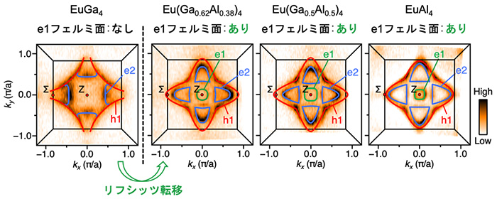 図2. Eu(Ga,Al)4においてSX-ARPESを用いて観測したフェルミ面の組成依存性。EuGa4では青線(e2)と赤線(h1)の二種類のフェルミ面のみ存在するのに対して、GaをAlで置き換えた物質では、緑線(e1)フェルミ面が新たに出現する。このようなフェルミ面の変化をリフシッツ転移と呼ぶ。
