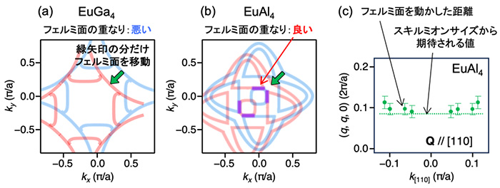 - (c) (b)中でフェルミ面が重なるように動かした距離(緑丸 = 緑矢印の長さ)と、スキルミオンの大きさから期待される移動距離(緑点線)の比較。両者が一致していることは、フェルミ面の重なりがスキルミオンの大きさを決めていることを示している。